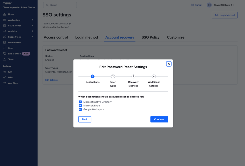 With Clever IDM, students and teachers can independently reset their passwords for key accounts like Google, Entra ID, and Active Directory directly through the Clever platform. This capability greatly reduces the frequency of access-related interruptions and frees you up to focus on more strategic initiatives. Additionally, when passwords are reset through Clever, we keep them in sync across your various IdP accounts.