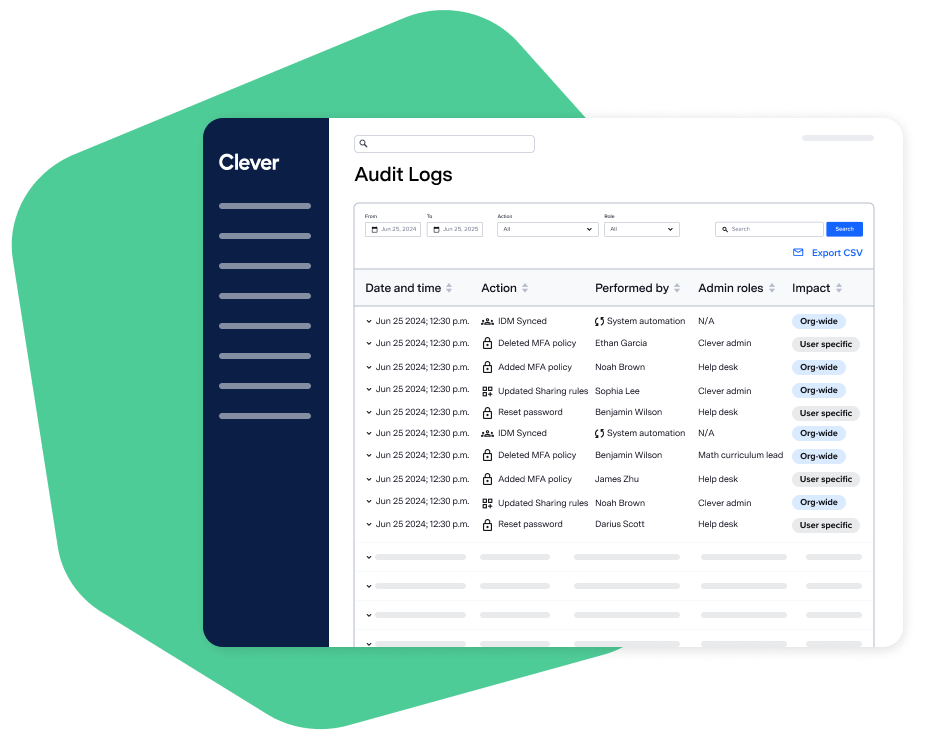 On visibility: a comprehensive audit log arriving by Back to School, downloadable MFA registration reports (a one-step answer for your cyber insurance provider), badge expiration tracking, direct Clever log export to SIEM solutions, and data changes in the dashboard after completing a sync conversion.